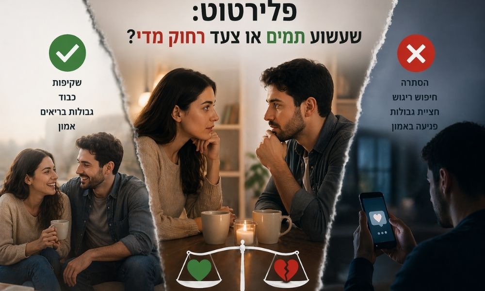 חשוב לזכור שכל זוג בונה לעצמו את מערכת החוקים שלו. יש זוגות שחיים בשלום עם פלירטוטים חיצוניים ורואים בהם שעשוע לא מזיק שמכניס ריענון לקשר ולכן השאלה האם פלירטוט זו בגידה היא לא רלוונטית בכלל. לעומת זאת, אצל זוגות אחרים, האמון מבוסס על בלעדיות רגשית ותשומת לב מוחלטת וכל סטייה מכך נתפסת כבגידה חמורה. אין כאן נכון או לא נכון מוחלט, אלא רק מה שנכון עבור שני האנשים שנמצאים בתוך הקשר. השקיפות היא זו שמבדילה בין משחק חברתי בריא לבין בגידה שמפרקת את היסודות. אם הפלירטוט הוא משהו שאפשר לספר עליו בבית בלי חשש, כנראה שהוא לא מאיים על הקשר. אם הוא נשמר בחדרי חדרים, יש כאן בעיה שדורשת התייחסות. בסופו של דבר, פלירטוט הוא עניין של מינונים וכוונות. כשהוא נעשה מתוך מקום של שמחת חיים וביטחון עצמי בלי כוונה לממש אותו ובלי להסתיר אותו הוא יכול להיות חלק נורמלי מהחיים. אבל כשהוא הופך למפלט מהזוגיות, כשהוא ממלא חלל רגשי שהתרוקן, או כשהוא פוגע בכבודו של בן הזוג, הוא מפסיק להיות תמים.